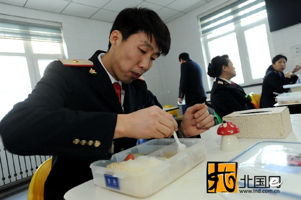 午餐时间到了,“牛三多”狼吞虎咽地吃完后返回售票岗位。他说,这样可以让其他职工多休息一会儿。