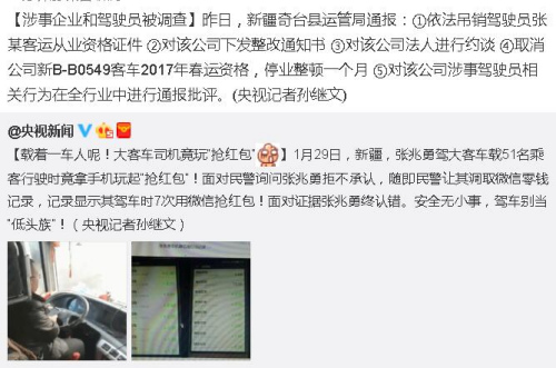 1月29日,新疆,张兆勇驾大客车载51名乘客行驶时竟拿手机玩起“抢红包”!面对民警询问张兆勇拒不承认,随即民警让其调取微信零钱记录,记录显示其驾车时7次用微信抢红包!面对证据张兆勇终认错。