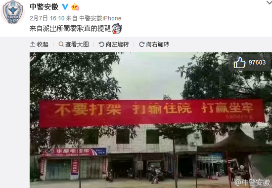 2月7日,@中警安徽贴出一张劝解别打架的标语,走红网络。此标语一出,立即引来各地警方官微的转发以及网友的热评。