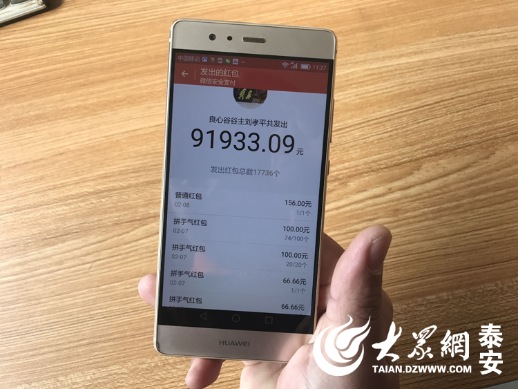 大众网泰安2月9日讯(记者 付莹)过年期间,微信红包已成为国人“新宠”,春节将近尾声,你收发了多少个微信红包?在山东泰安,就有这么一位网名“良心谷谷主刘孝平”的“红包哥”,短短一个月就在陌生网友群里发出了17736个红包,共发出91933.09元。金额最多时,一天就发了近4万元。”一位偶然进入”良心谷“红包群的网友告诉记者,春节短短七天,最多的一天就抢了“谷主”800元红包,“我摸清了他发红包的规律,每天等着,为了抢红包,大年三十都没顾得上和爸妈好好说话。”还有一位网友在打开支付宝的积“福”开奖后,看到中奖金额,感叹“谷主比马云对我们好”。