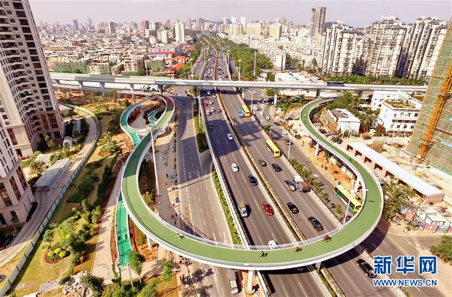 这是厦门市湖里区云顶中路和仙岳路交叉口的空中自行车道(2月9日摄)。1月26日,全国首条空中自行车道——福建厦门云顶路自行车快速道示范段试运营。这条全程高架的空中自行车道全长7.6公里,试运营以来吸引众多市民前来骑行体验,感受“空中骑行”的独特魅力。 新华社记者 林善传 摄 图片来源:新华网