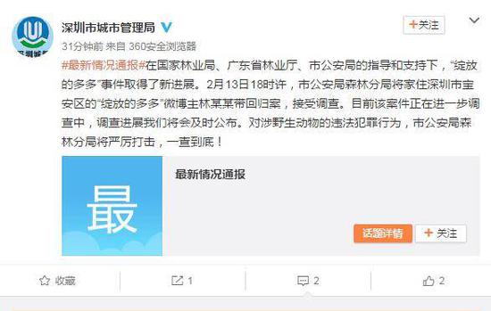 深圳市城市管理局官方微博2月14日消息,在国家林业局、广东省林业厅、市公安局的指导和支持下,“绽放的多多”事件取得了新进展。2月13日18时许,市公安局森林分局将家住深圳市宝安区的“绽放的多多”微博主林某某带回归案,接受调查。目前该案件正在进一步调查中,调查进展我们将会及时公布。对涉野生动物的违法犯罪行为,市公安局森林分局将严厉打击,一查到底!