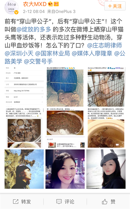 此人微博名为“绽放的多多”。微博注册信息显示该女为深圳某设计工程公司,具体职务不详。从其微博看出,穿山甲、蛇、天鹅甚至猫头鹰……该女子常年食用野味。