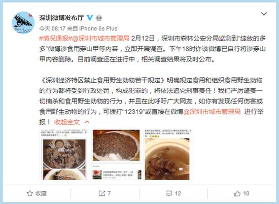 2月13日上午,广东省深圳市互联网信息办公室官方微博“深圳微博发布厅”发布微博称,12日,深圳市森林公安分局监测到网友“绽放的多多”微博涉食用穿山甲等内容,立即开展调查。当天下午18时许该微博已自行将涉穿山甲内容删除。目前调查还在进行中,相关调查结果将及时公布。