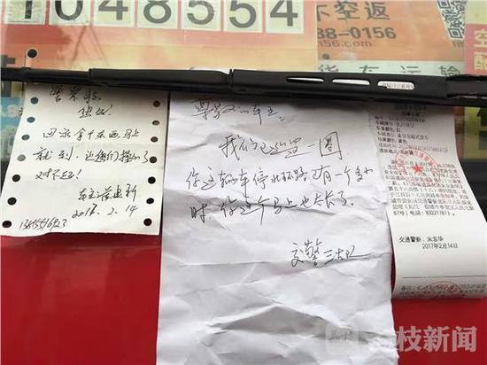 “贴了一张条说,警察同志,我回家拿一下东西,马上就回来,敬请你原谅。”朱忠华告诉记者,“货车停在小区门口,可能人家真有急事,人性化执法,我们就想算了吧,而且他马上就走了,不妨碍交通就行了。”见着纸条上语气诚恳,而说好“马上就到”,交警就网开一面,和同事到别处巡逻。