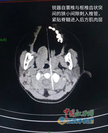当班医生于第一时间请来擅长治疗上颈椎病的姚浩群副主任医师会诊。据姚主任根据CT平扫判断,竹签经寰椎与枢椎齿状突之间的狭小间隙刺入椎管,紧贴脊髓进入后方肌肉层。“竹签已经贯通椎管,并且所在的椎管正是呼吸、心跳等生命中枢所处的位置,因此如果进行这一位置的异物取出,孩子随时可能有生命危险。”南昌大学第一附属医院姚浩群副主任医师对王女士解释道。