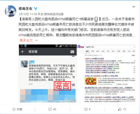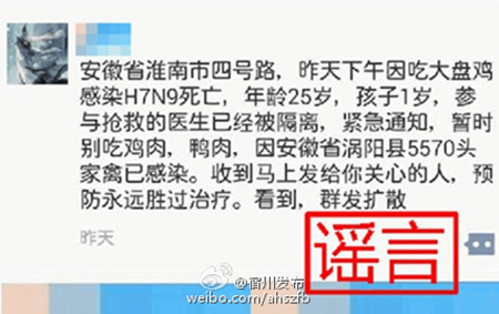 连日来,微博、微信朋友圈有消息称:“淮南一市民昨天下午因吃大盘鸡感染H7N9死亡,25岁,孩子1岁,参与抢救的医生已被隔离,紧急通知,暂时别吃鸡肉鸭肉。因安徽涡阳县5570头家禽已感染。收到马上发给你关心的人,预防永远胜过治疗。看到,群发扩散。”19日,安徽省淮南市人民政府通过官方微博辟谣称:“目前淮南市没有发现人感染H7N9禽流感的死亡病例,朋友圈疯传的淮南市市民因感染H7N9病毒死亡的消息为假消息。