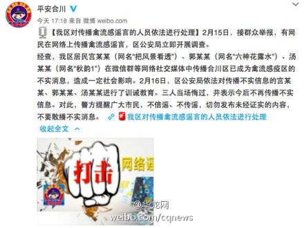 重庆合川3网民传播禽流感谣言,被警方依法进行处理。重庆市合川区公安局官方微博@平安合川 发布通报,2月15日,接群众举报,有网民在网络上传播禽流感谣言,合川区公安局立即开展调查。经查,合川区居民宫某某(网名“把风景看透”)、郭某某(网名“六神花露水”)、汤某某(网名“秋韵1”)在微信群等网络社交媒体中传播合川区已成为禽流感疫区的不实消息,造成一定社会影响。