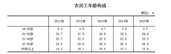 2011-2015年我国农民工年龄构成表。图片来源:国家统计局