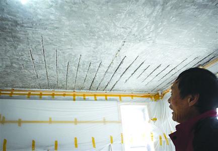 别墅天花板水泥脱落后,钢筋暴露在外。 /晨报记者 张佳琪