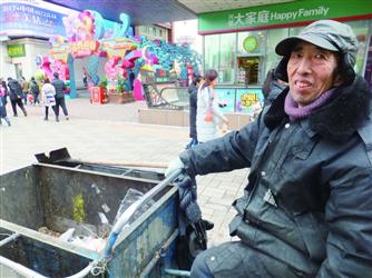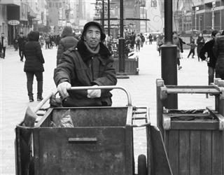 昨日下午1时许,记者在中街步行街见到正在收拾卫生的赵永久。工作服袖子已经裂口,一双皮鞋破旧不堪。56岁的赵永久冻得流了鼻涕却来不及擦一下,一个垃圾桶挨着一个垃圾桶往车上倒垃圾。