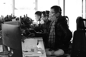 沿着数列长条形的办公桌望过去,几乎一半的员工都戴着口罩。午休时间,两名女员工甚至戴着防毒面具,在座位上睡觉。记者发现,戴有类似防毒面具的员工不下10人。