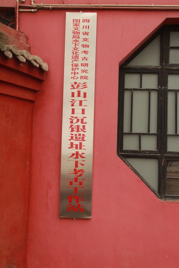 沿着岷江右岸往东北走,可以抵达一处红色的古建筑,为“彭山县汉崖墓博物馆”,只是现在已经改弦易辙,门口挂上“彭山江口沉银遗址水下考古工作站”的大牌。一个保安将侧门拉开一个缝,说现在已经不再开放了,必须凭工作证进入,还说再次开放要等三年以后了。