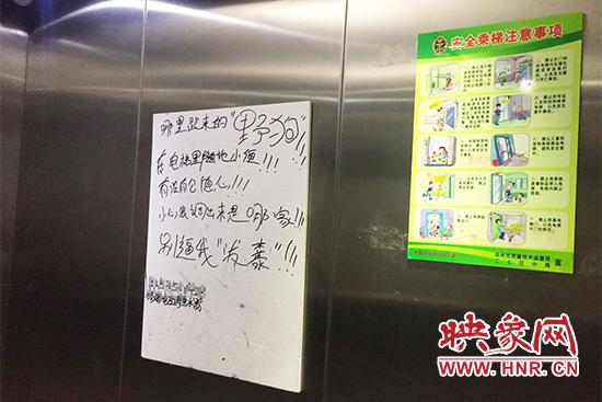 “哪里跑来的‘野狗’,在电梯里随意小便,有没有公德心,小心我调出来是哪家,别逼我泼粪。”其中一名小区业主看不下去,在电梯里的广告板上留言。