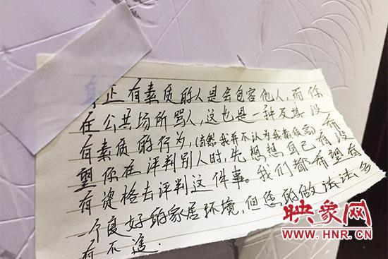 而宠物狗的主人看到留言后,写了一张纸条回复:真正有素质的人是会包容他人,而你在公共场所骂人,这也是一种及其(极其,记者注)没有素质的行为,当然,我并不认为我素质高……