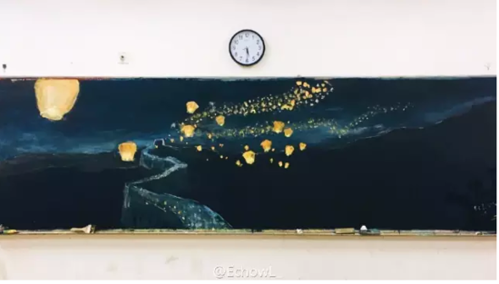 黑板上是一幅水粉画。夜幕下的长城上空,漫天的孔明灯正徐徐升起。