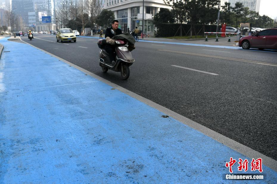 2月28日,成都市高新区吉泰路车来车往,道路两侧的非机动车道被涂上天蓝色后尤为醒目。据了解,这条蓝色非机动车道由成都市高新区近日打造,为骑行者推出的“健康道”。 中新社记者 张浪 摄