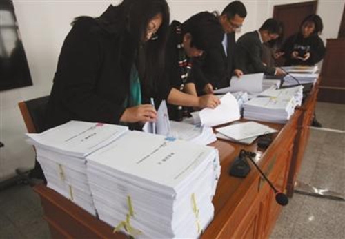 2017年2月15日,《锦绣未央》被诉侵权案交换证据,原告方提交的证据摆满了原告席。新京报记者 王贵彬 摄。图片来源:新京报