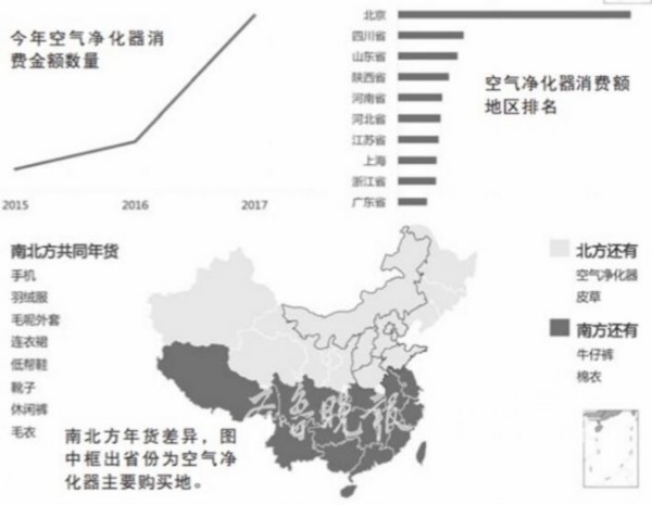 京东大数据显示,山东人购买空气净化器的环比增长非常明显,接近三倍。阿里巴巴大数据显示,包括山东在内的几个北方省份,在今年体现出对于空气净化器的强劲购买力。各省的空气净化器消费排行,几乎就等同于一份空气质量报告。