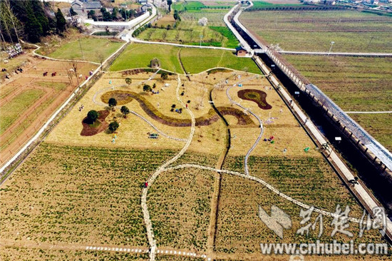 航拍宜昌一农田被绘出“龙”形图案。通讯员望作信 摄