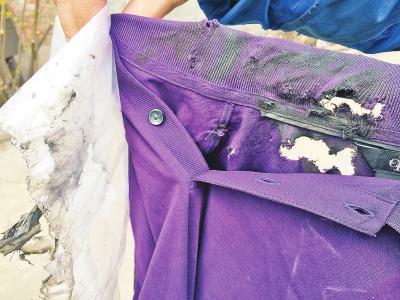 昨天上午10时,记者见到了这些被损坏的衣物。牧先生拿着一件被绞了11个口子的紫色T恤说,他平时利用业余时间,在朋友圈里卖一些衣物。今年2月4日,因客户需要,他通过申通快递的业务员,把两件国外进口的T恤衫、一个手提皮包和一只旅行水壶,从郑州市中原区寄给住在二七区的客户。2月7日,他接到申通快递员的电话,说这些衣物被拒收退货了。他与客户取得联系后,对方十分气愤,说他寄来的衣物,包装袋上全是机油,里面的衣服有多处烂口子,皮包上有明显的划伤,金属水壶也瘪了一个大坑。