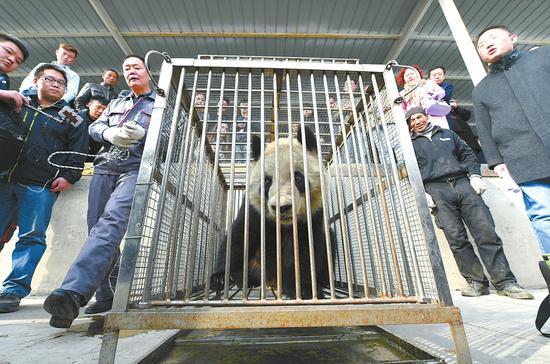 3月16日,在兰州中川国际机场,大熊猫“蜀兰”等待转运。新华社发
