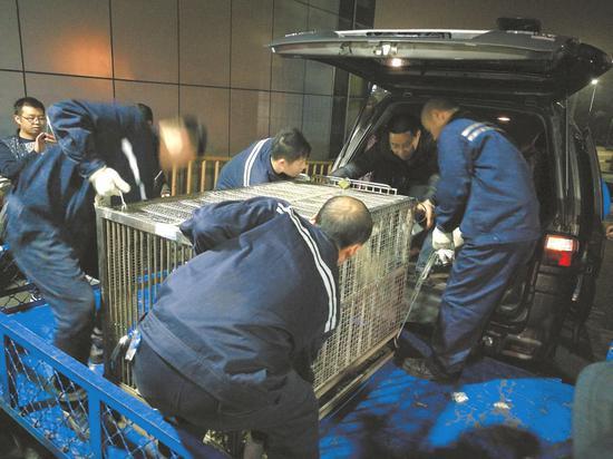 经过近一个半小时的空中旅行,刚下飞机的“蜀兰”还有一点惊慌。面对机场运输工作人员,她有些焦虑地在笼子里转来转去,变换姿势。