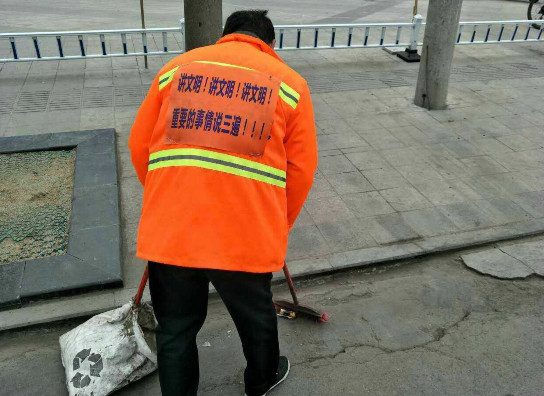“不少路人看到这些温馨标语,纷纷驻足拍照。”据马路街环卫站的负责人介绍,他们此次共向环卫工人们发了206套贴有温馨标语的工作服,很多市民对此举也表示支持。