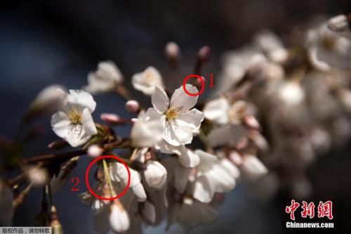 图注1为樱花花瓣上的缺口,桃花无缺口。图注2为樱花的花梗,桃花则没有花梗。