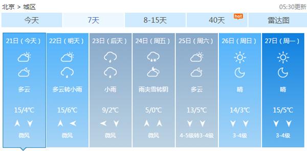 上周的北京暖意融融,春天似乎已经近在咫尺,然而昨日的一场冷雨,打乱了北京进入气象意义上春天的步伐。根据未来7天天气预报,北京本周仍以多云到阴为主,周三、周四、周五或还有降水天气过程,其中周五的最高气温或降至5℃,最低气温则有可能被打回0℃,寒意明显。