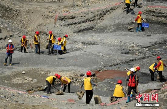 在媒体获准进入区域的左侧前方5米左右,20多名考古人员正在深沟里进行作业。据参与考古的相关人员介绍,本次出土的文物,大部分都集中在沙石底部的基岩上。