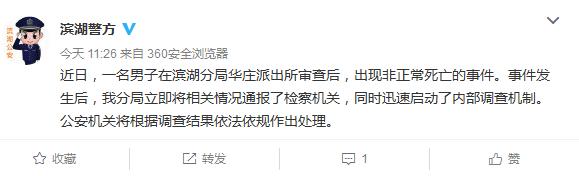 原标题:江苏滨湖一男子派出所审查后非正常死亡 警方内部调查
