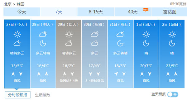 昨天开始,北京告别阴冷天气,气温开始回升。北京市气象台预计,未来三天仍将以晴到多云天气为主,气温缓慢回升;不过28日夜间至29日白天扩散条件略有转差。