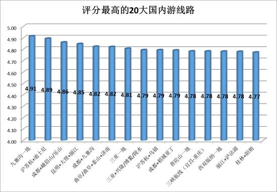 全国各地,哪些旅游线路的评分和满意度最高?报告发布了“评分最高的20大国内游线路”,九寨沟一地、沪苏杭+迪士尼、成都+峨眉山乐山、昆明+大理+丽江、曲阜+泰山+济南、三亚一地等排名在全国领先。优质线路主要来自四川、云南、江浙、两广、海南等地。这些线路点评分最低也达到4.79分,最高的超过4.9分。