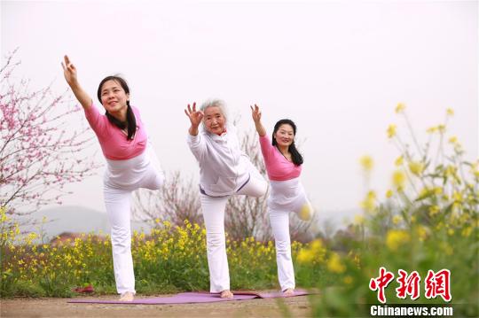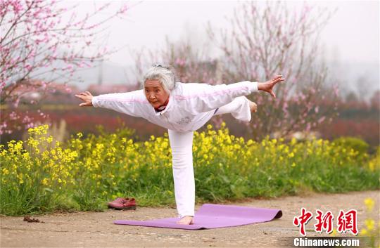 中新网襄阳3月29日电(周政 丁心栓)从61岁接触瑜伽至今,湖北襄阳75岁老太康光英练就了一身硬本领。罗汉睡式、鹤式、骆驼式、肩倒立式……瑜伽中的几个高难度动作,她施展起来毫不费力,还能轻松劈下“一字马”。