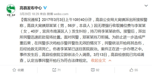 原标题:四川男子砍伤人拒捕被击毙 检方认定民警开枪合法