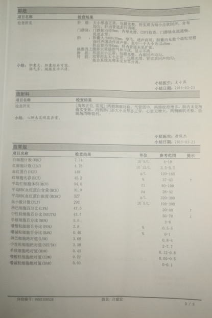 2015年3月,计建宏的体检报告显示“心肺未见明显异常”。 受访者供图