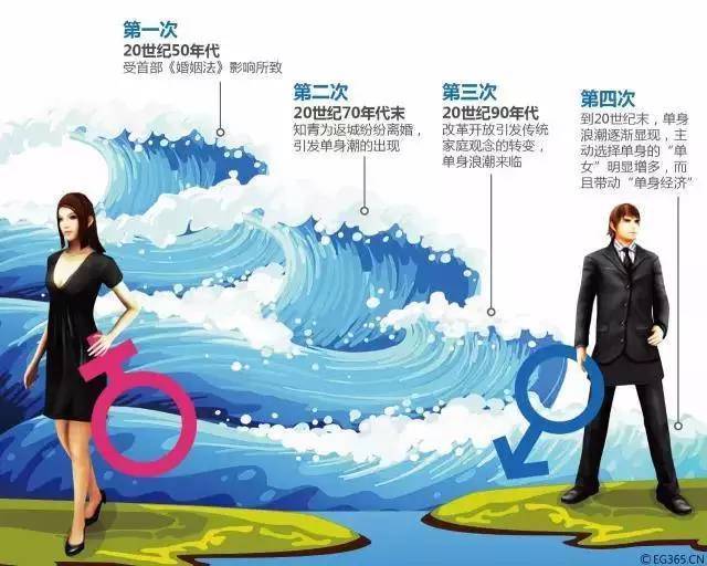 中国内地曾经出现过几次单身潮。第一次是在20世纪50年代,首部《婚姻法》带来了全国的离婚潮;20世纪70年代末,知青为了返城纷纷离婚,引发了第二次单身潮的出现;20世纪90年代以来,改革开放引发传统家庭观念的转变,第三次单身浪潮来临; 到现在,随着经济的飞速发展和女性自主意识的提升,第四次单身浪潮逐渐显现。