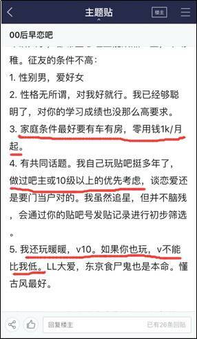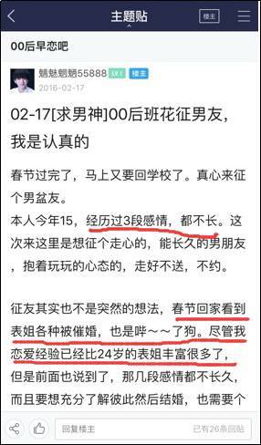 百度贴吧里的“00后早恋吧”里已经有了两千多万的帖子,去年还有一位00后曾贴出“征婚帖”: