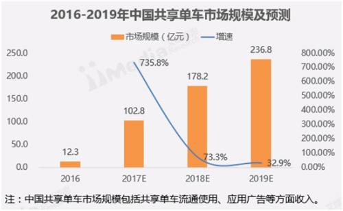 iiMedia Research(艾媒咨询)数据显示,2016年中国共享单车市场规模为12.3亿元,预计在2017年将达到102.8亿元,增长率高达735.8%;而用户规模为0.28亿人,预计在2017年将达2.09亿人,增长率亦有646.4%,中国共享单车市场将继续保持超高速增长。
