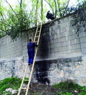4月2日下午1时许,这位妇女打电话询问后称,可以带人过去,但需要交10元的车费。记者同意后,这位妇女开着摩的,将两名记者拉到西安秦岭野生动物园旁的内苑村村子里,在一个紧挨着围墙的路边,有三个年轻小伙子在墙边架着4米多高的竹梯,三人陆续上墙顶后,将另外一个竹梯搭在另外一边,其中一人坐在墙顶,另外两人进入园区内看有无安保人员经过,确认无误后招呼记者上墙进入园区(如图)。