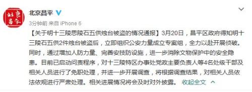 北京市昌平区官方政务微博今日晚间发布消息称,3月20日,昌平区政府得知明十三陵石五供2件烛台被盗后,立即组织公安力量成立专案组,全力以赴开展侦破。同时,通过增加人防力量、完善安技防设施,进一步消除文物保护中的安全隐患。