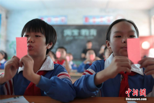 资料图:“云端课堂”的普通话课上,学生们正用嘴对着纸片做爆破音练习。 马义恒 摄