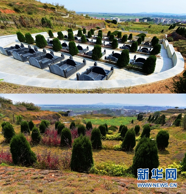 拼版照片:上图为福建省福清市海口镇晨光村一处占地500多平方米、有26个墓穴的违章修建的豪华墓群,其中23个墓穴是活人墓(2016年3月25日摄);下图为同一处地点上的墓穴已经被拆除或迁出,墓穴上覆盖着黄土和树木(2017年4月1日摄)。新华社记者 魏培全 摄