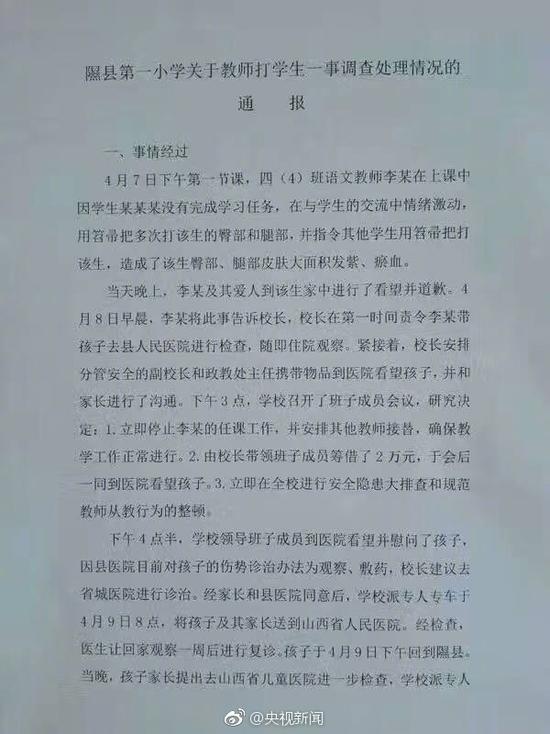 山西隰县第一小学关于教师打学生一事调查处理情况的通报。 @央视新闻 图