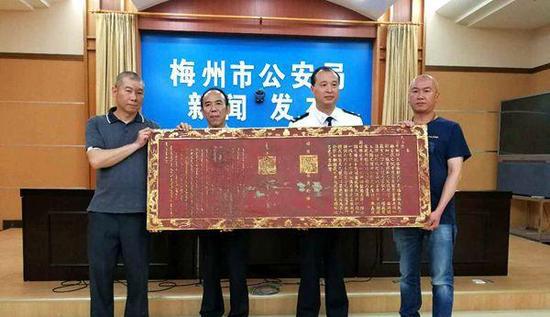 3月21日,梅州市公安局收到梅江区三角镇大坜村兰轩公祠叶氏宗族人员和海外乡亲联名来信,反映清代圣旨匾额被盗情况。据叶氏宗亲介绍,其先祖叶舒华在约150年前的清代任朝庭官员,因政绩非凡受朝庭褒扬,先后获授咸丰、同治皇帝圣旨匾额共3块,另有3副共6块的对联竖匾、1块清末翰林游显廷题写“退一步想”的横匾。上述匾额的市场估值近百万元,一直交由族中人员叶某胜代为保管,发现被盗后向公安机关报案。