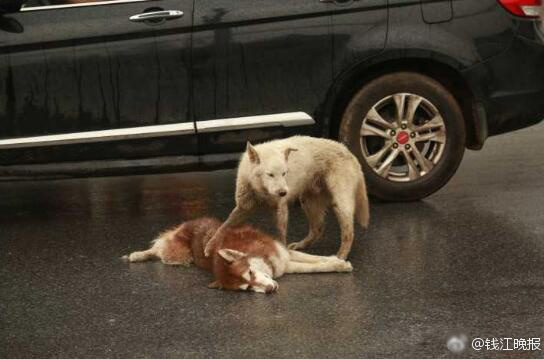 据钱江晚报报道,2017年4月17日,浙江省衢州市衢江区廿里镇中兴路出现感人一幕:一只狗被汽车撞死横卧路中,另一只狗不顾危险,呜咽着蹲守在同伴身边半个多小时不愿离去。