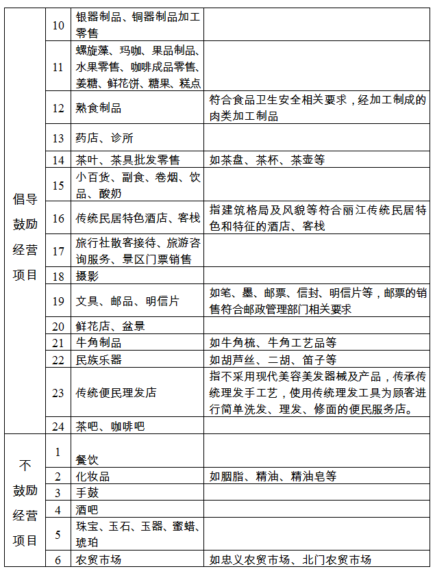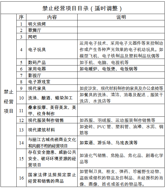 禁止经营项目是指与遗产风貌保护、丽江古城传统商业文化不符,以及存在安全隐患、国家明令禁止经营的经营项目。