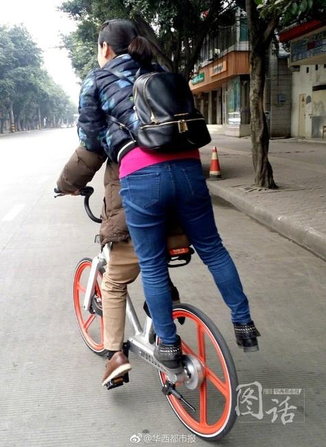 最近,成都的共享单车界,出现一波“花式载人”的节奏:有坐车筐上的,有站链条盖上的,有站(坐)后轮胎盖上的,还有俩人“共享”车座的……