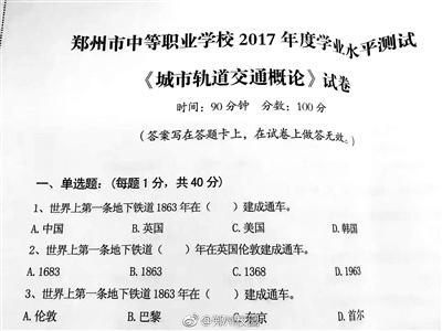 一张郑州市中等职业学校的试卷连日来引发热议,这张试卷选择题的前三道源于同一个内容:“世界上第一条地下铁道1863年在英国伦敦建成通车”,区别只是抠了不同的位置作为选择题的选项。试题公布到网上后立刻被冠上“雷人试题”的称呼。
